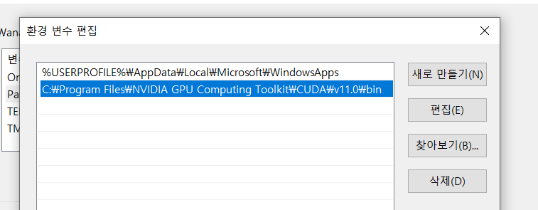 C:\Program Files\NVIDIA GPU Computing Toolkit\CUDA\v11.0\bin 경로를 추가한다.