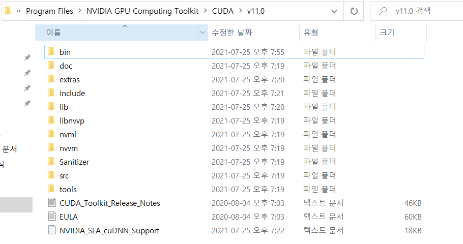 C:\Program Files\NVIDIA GPU Computing Toolkit\CUDA\v11.0 여기에 붙여넣기 한다.