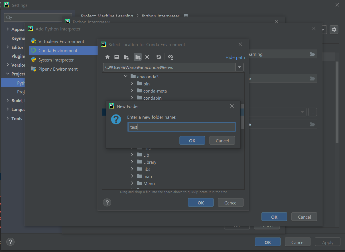 -> Location : C:\Users\Wana\anaconda3\envs -> New Folder -> "가상환경 이름" -> ok
