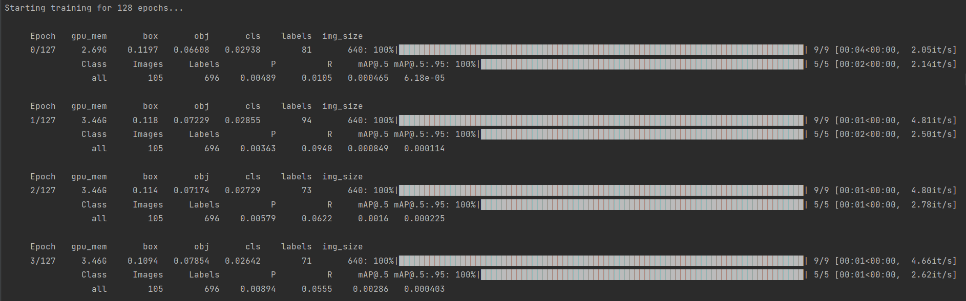 python train.py --img 640 --batch 12 --epochs 128 --data data/coco128.yaml --cfg ./models/yolov5s.yaml --weights yolov5s.pt --name yolov5_mask_det_e128 --device 0