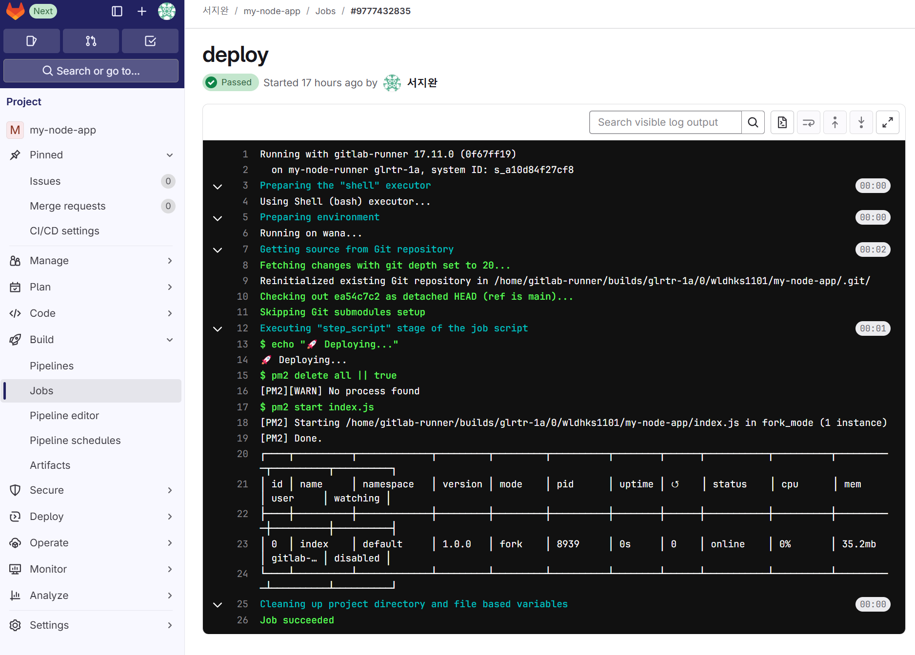 - 첫 push에서 에러가 발생했는데 .gitlab-ci.yml의 display script 에 따라 pm2 start app.js 명령을 수행할 때 app.js 파일이 없어서 에러가 발생했습니다. 저는 index.js 파일을 올렸기 때문에 pm2 start index.js 로 명령어를 변경하여 해결했습니다.